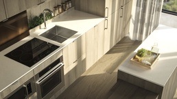 Composite quartz countertop and kitchen backsplash
